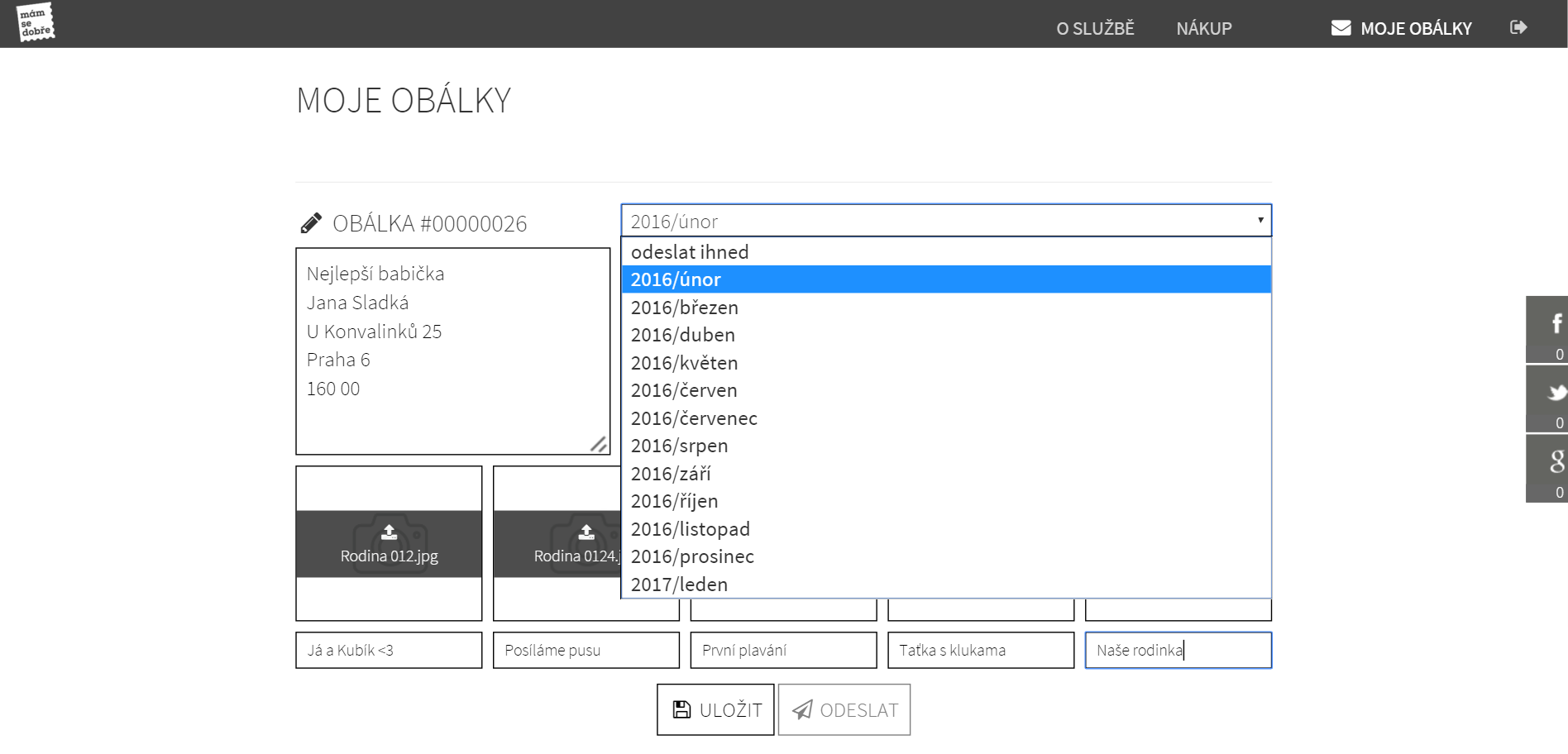 Odeslání v určitý měsíc - tato možnost je vhodná, pokud chceš obálky odesílat pravidelně. Zakoupíš si více obálek, vyplníš je a příjemce může očekávat obálku vždy na začátku nového měsíce. Obálky je možné editovat do 25. ve zvoleném měsíci. Pokud to nestihneš, bude obálka automaticky přesunuta na další měsíc.