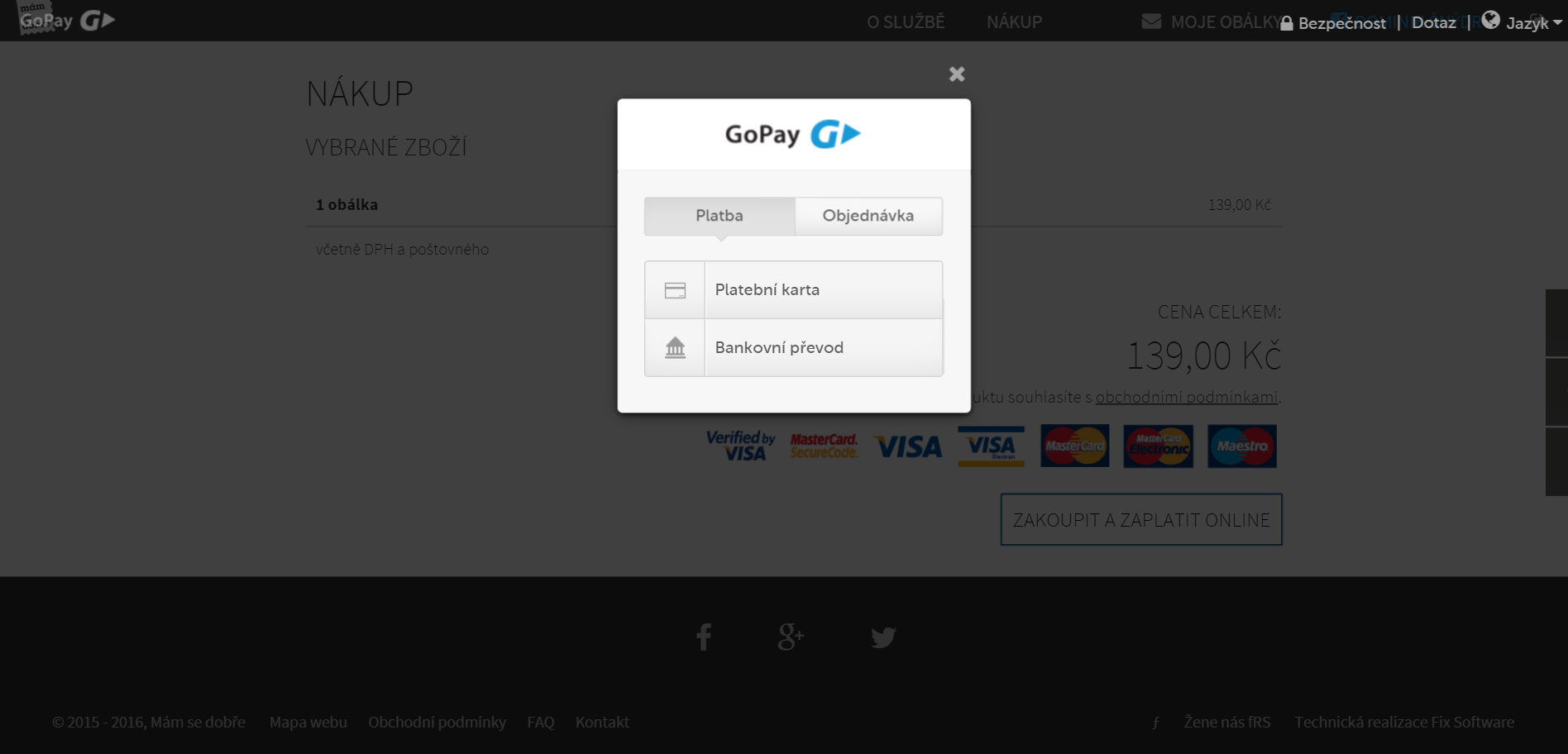 Platba - vše můžeš zaplatit buď kartou online nebo bankovním převodem. Máme k dispozici i metody rychlých plateb, na podrobnosti se podívej přímo na platební bráně.
